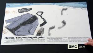 The concept Don presents shows a Reggie Perrin-style escape: a suit of clothes – a suit very much like Don’s own – abandoned on a beach, with footprints in the sand leading into the waves. The headline reads, “Hawaii. The jumping off point.”