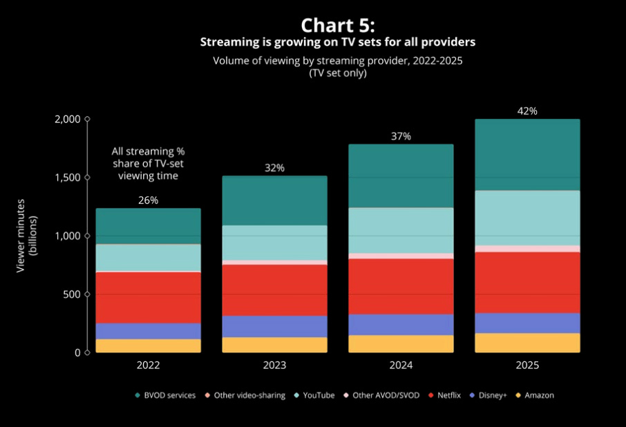 When independent measurement places YouTube in the same frame as broadcasters and streamers, the difference becomes visible. And difference complicates equivalence claims like “YouTube is the new TV”.