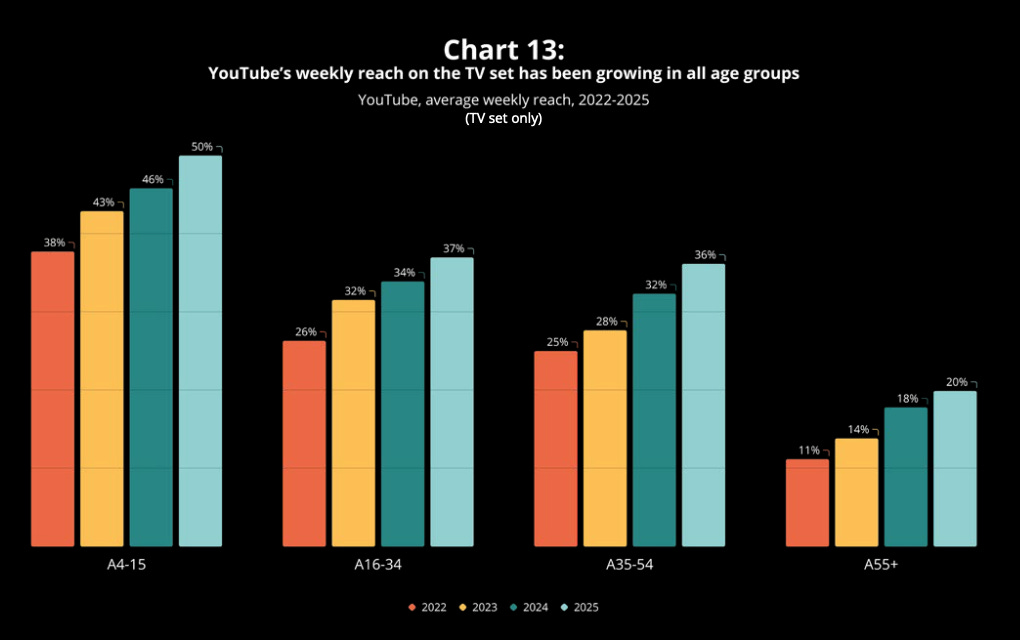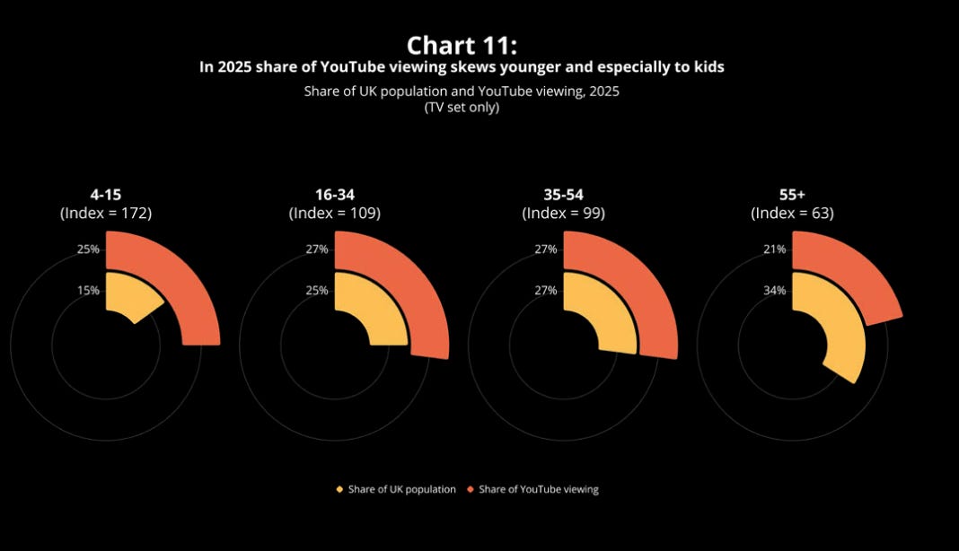 And the audience is broadening: YouTube viewing is “prevalent in all age cohorts” and BARB notes that TV-set reach among 55+ viewers has almost doubled since 2022.