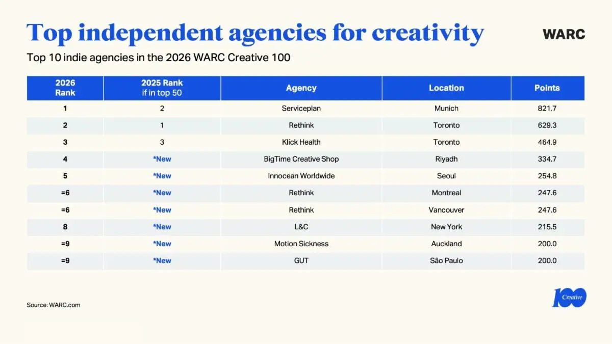 WARC, now part of the Cannes Lions set-up, has announced its latest Creative 100, the most awarded campaigns and companies.